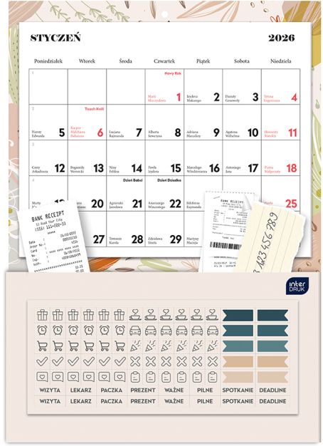 Zawiera kolorowe naklejki do oznaczania ważnych dat. Dwa wzory do wyboru.