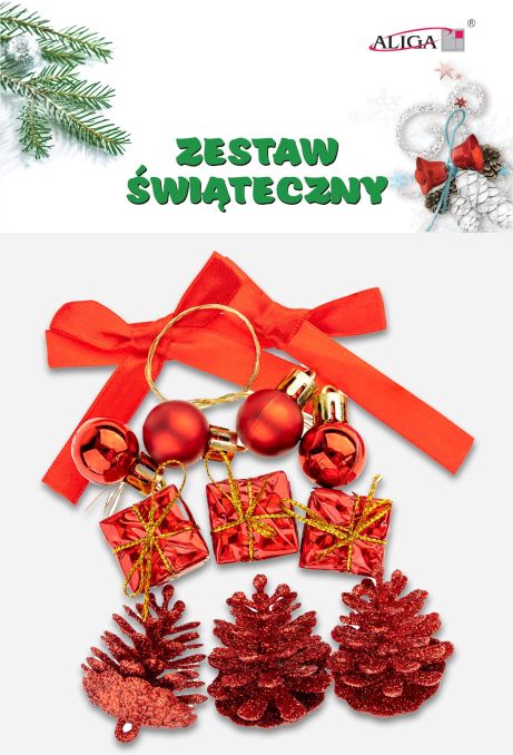 Aliga » Boże Narodzenie » Zestaw świąteczny SGD-03 - 4 bombki, 3 miniprezenty, 3 szyszki, 2 kokardki, 4 sznureczki, kolor czerwony