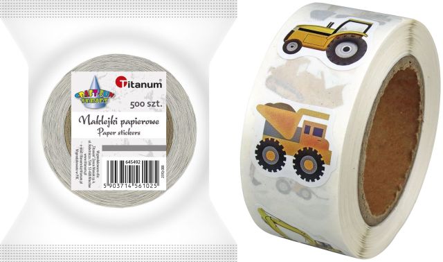 Titanum » Artykuły dekoracyjne całoroczne » Naklejki Dekoracyjne » Naklejki papierowe na taśmie 8 wzorów maszyny budowlane mix rozmiarów żółto-czarne 500szt. szerokość taśmy 28mm