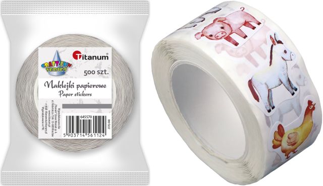 Titanum » Artykuły dekoracyjne całoroczne » Naklejki Dekoracyjne » Naklejki papierowe na taśmie 8 wzorów mix rozmiarów zwierzęta gospodarskie 500szt. szerokość taśmy 28mm