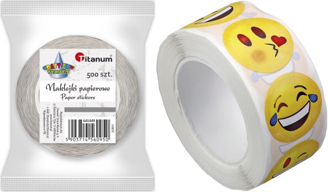 Titanum » Artykuły dekoracyjne całoroczne » Naklejki Dekoracyjne » Naklejki papierowe na taśmie 4 wzory emotikony O25mm żółte 500szt. szerokość taśmy 28mm