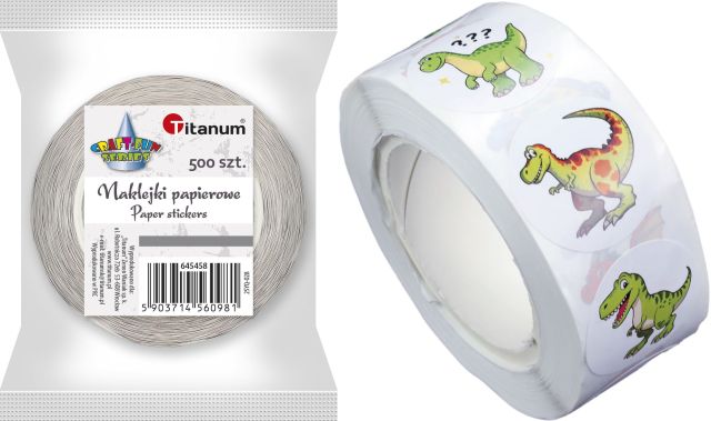 Titanum » Artykuły dekoracyjne całoroczne » Naklejki Dekoracyjne » Naklejki papierowe na taśmie 12 wzorów dinozaury O25mm 500szt. szerokość taśmy 28mm