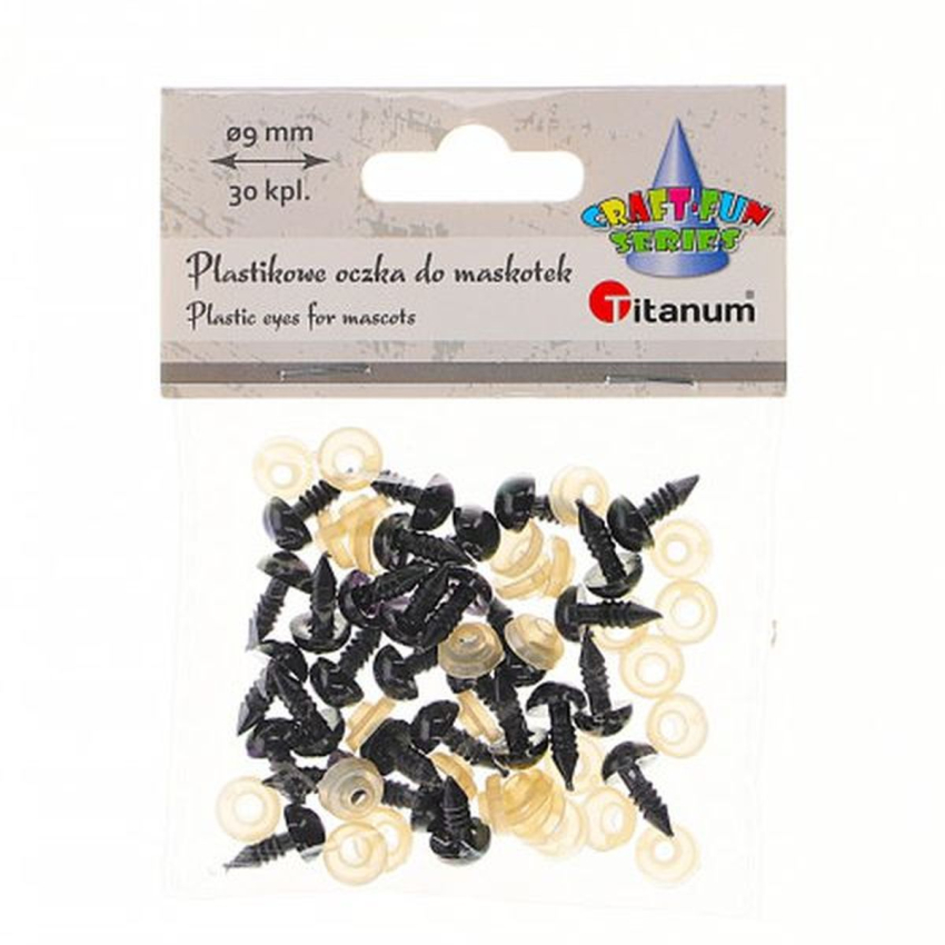 Titanum » Artykuły dekoracyjne całoroczne » Oczka Dekoracyjne » Oczy do maskotek plastikowe O9mm z mocowaniem za pomocą zapinki czarne 30kpl.