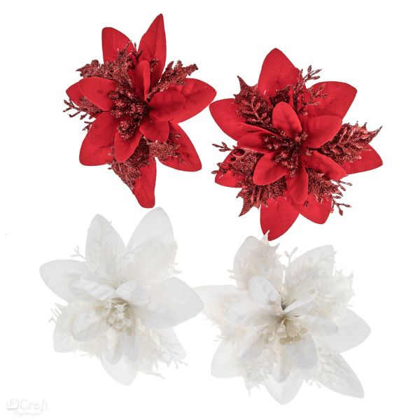 Klasyczna świąteczna ozdoba w eleganckim wydaniu! Zestaw 4 dekoracyjnych kwiatów poinsecji w dwóch kolorach – białym i czerwonym – to idealny dodatek do stroików, choinek, wieńców, prezentów i innych bożonarodzeniowych aranżacji.