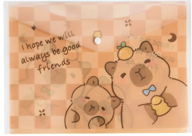 Praktyczna teczka w formacie A4 z wygodnym zatrzaskiem, idealna do przechowywania dokumentów. Ozdobiona uroczym motywem kapibary w beżowym kolorze, doskonale sprawdzi się w szkole, biurze lub domu.