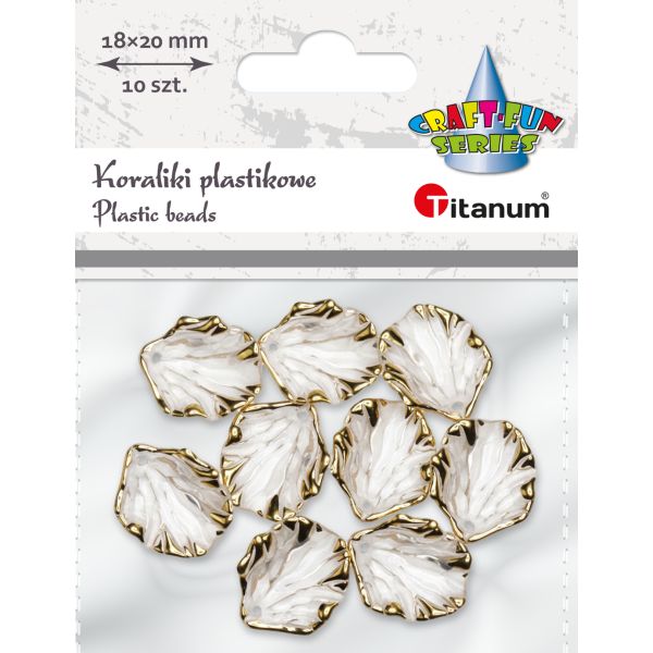 Titanum » Artykuły dekoracyjne całoroczne » Koraliki, Guziki » Koraliki plastikowe muszelki przezroczyste ze złotym wykończeniem 18x20mm (grubość 5mm) dziurka O1mm 10szt.