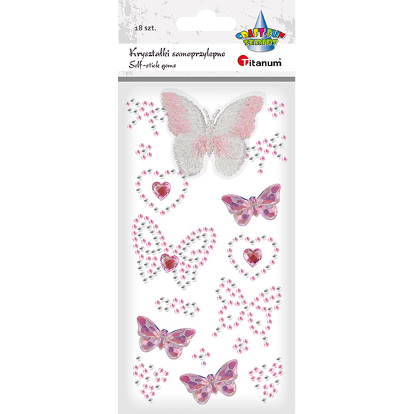 Titanum » Artykuły dekoracyjne całoroczne » Kryształki, Perełki » Kryształki samoprzylepne motyle mix (w tym z kryształków 45x37/35x33mm, akrylowe 32x18mm, z muliny na tkaninie 54x45mm, serca 27x25mm) różowe 18szt.