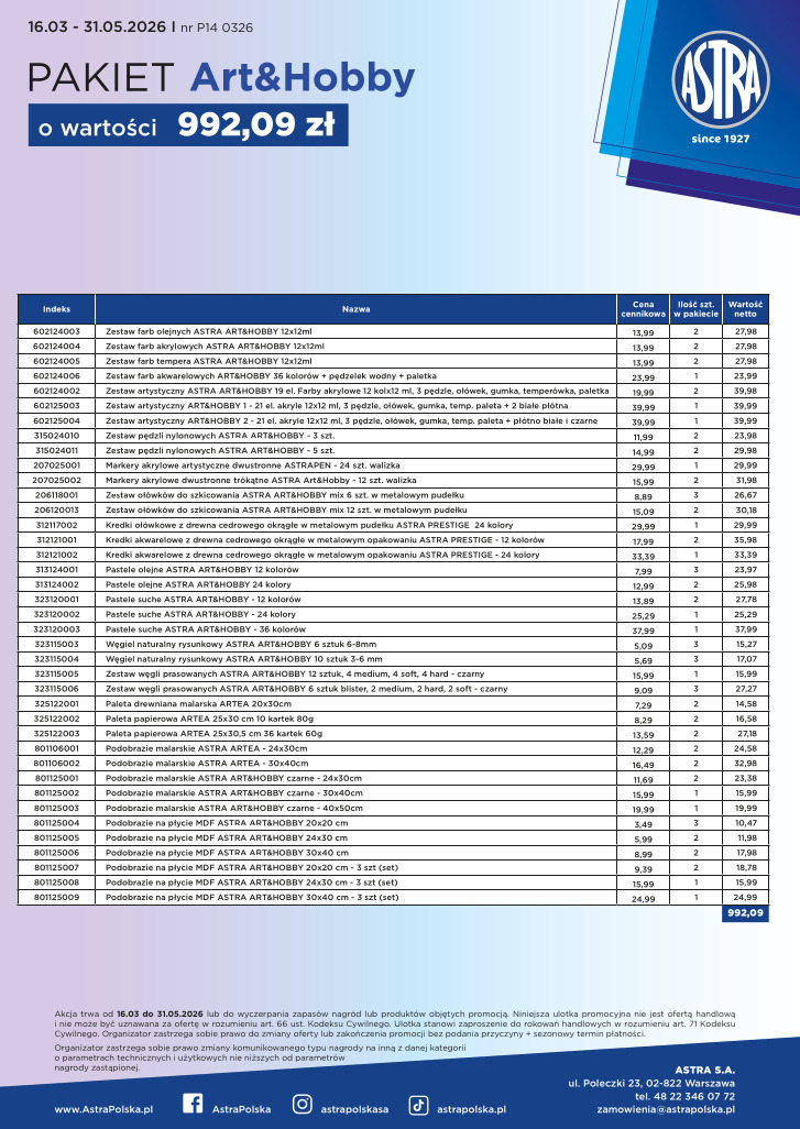 Pakiet P14 0326 ASTRA ArtxHobby o wartości 992, 09zł + GRATIS: towar lub grill
