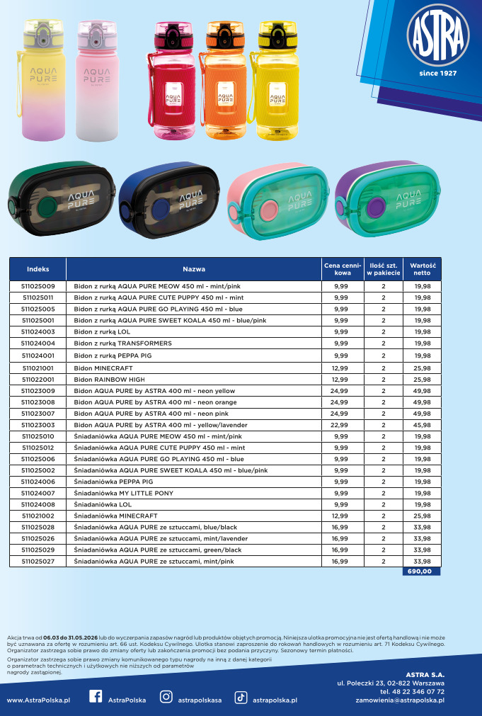 Poniższe ceny poszczególnych produktów to ceny katalogowe ASTRA - aby uzyskać ceny oferowane przez hurtownię Seneks należy od nich odliczyć kwotę rabatu.