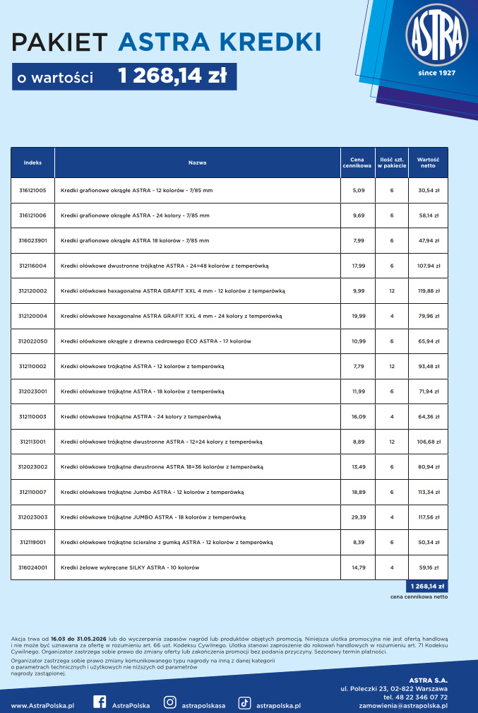Pakiet P08 0326 ASTRA kredki o wartości 1268, 14 + GRATIS: towar lub talerze