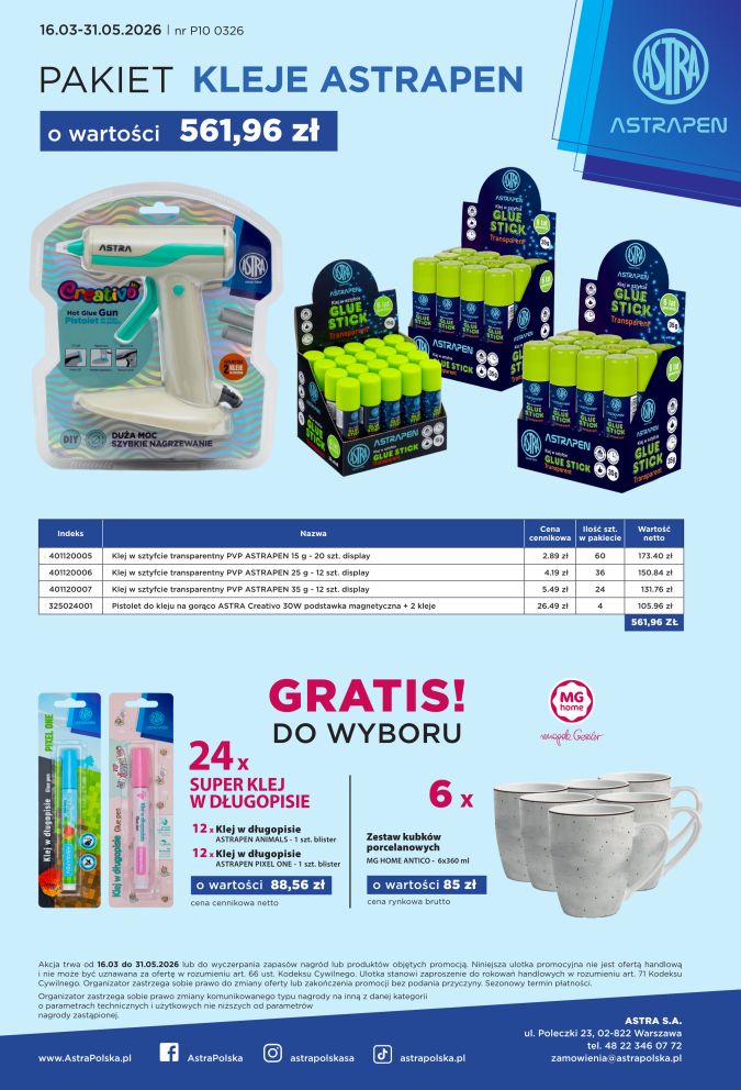 Pakiet P10 0326 ASTRA Astrapen Kleje o wartości 561, 96zł + GRATIS: towar lub kubki