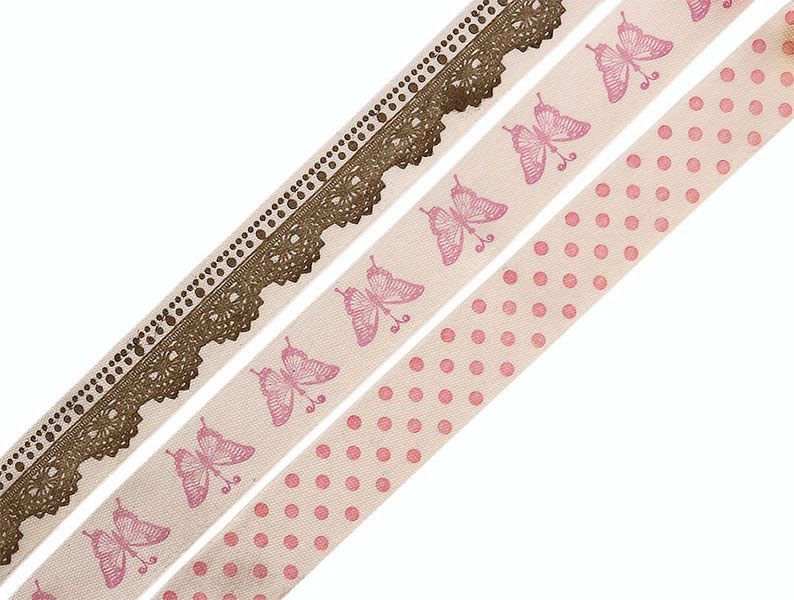 Titanum » Artykuły dekoracyjne całoroczne » Wstążki, Sznurki, Taśmy, Kokardy itp. » Wstążka bawełniana 3 wzory 15mm x 1 m wzory: groszki, motylki, koronka
