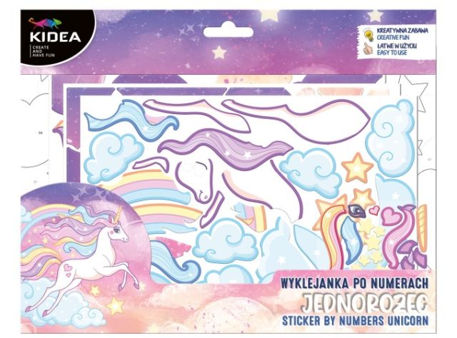 WYKLEJANKA PO NUMERACH JEDNOROŻEC KIDEAStwórz piękne obrazy bez farb i pędzli. Wyklejanie po numerach. Obraz ma ponumerowane pola, które uzupełnia się odpowiednimi naklejkami z załączonych arkuszy. Każdy numer wskazuje, którą naklejkę gdzie należy przykleić, dzięki czemu zabawa jest prosta... |