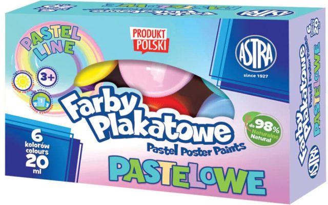 Farby plakatowe pastelowe Astra 6 kol x 20 ml STANDARD BOX [opakowanie=8szt]• bardzo wydajne, kryjące farby wodorozcieńczalne • czyste i intensywne barwy • do malowania na papierze, kartonie, drewnie, nieglazurowanej ceramice, kamieniu • odporne na działanie światła i ścieranie |