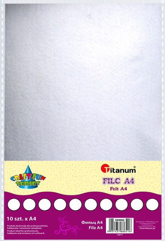 Filc dekoracyjny 8szt. Biały Opakowanie zawiera 8 arkuszy filców w rozmiarze A4 w białym kolorze. |