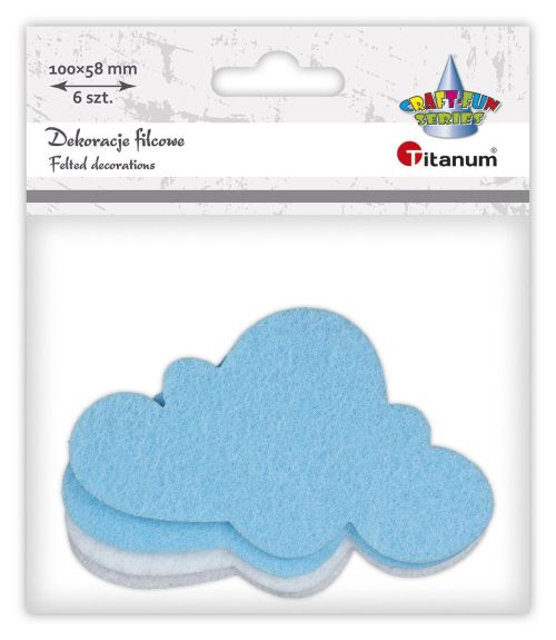Filcowe dekoracje chmury 100x58mm 6szt. niebieskie x3, białe x3Filcowe dekoracje chmury, wymiary: 100 x 58 mm, niebieskie i białe, grubość filcu 2mm. 6 sztuk. |