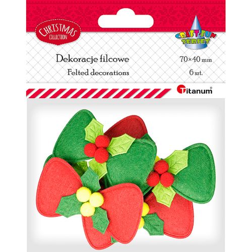 Filcowe kokardki 70x40mm z ostrokrzewem z filcu i pomponów czerwone, zielone 6szt. Miękkie, filcowe dekoracje, wypukłe.