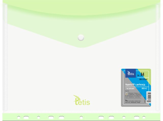 Koperta PP na zatrzask, mieszcząca format A4. Wymiary koperty: 330x235 mm, grubość tworzywa: 0,14 mm. Opakowanie: folia 12 sztuk.