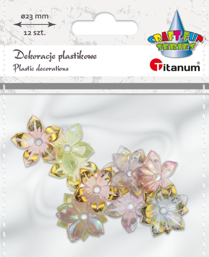 Koraliki plastikowe kwiatki O23mm Odziurki 2mm mix pastelowy złote wykończenia 12szt. |