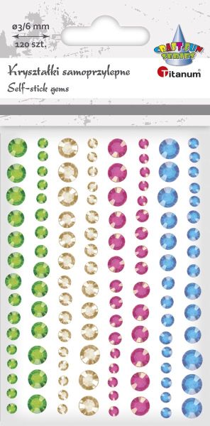 Kryształki samoprzylepne. Wzór: okrągłe, średnica 6 mm i 3 mm, mix 4 kolorów pastelowych: jasnozielony, pomarańczowy, różowy, niebieski. 120 sztuk.