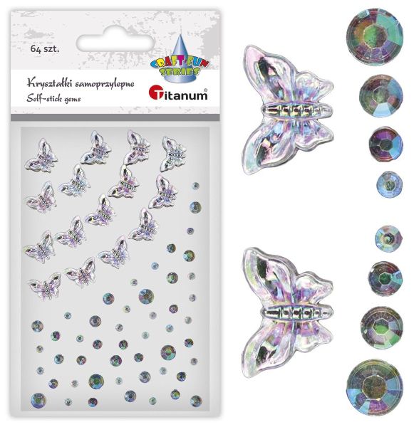 Kryształki samoprzylepne motyle 14x10mm-15szt., okrągłe 3/4/5/6mm-49szt. przezroczyste 64szt. Kryształki samoprzylepne motyle 14x10mm-15szt., okrągłe 3/4/5/6mm-49szt. przezroczyste 64szt.