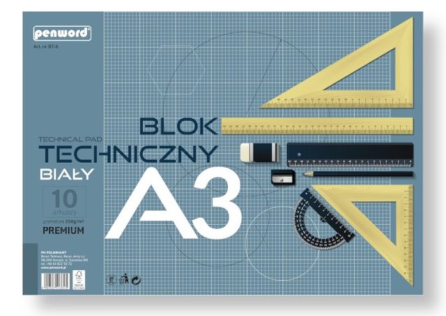 BLOK TECHNICZNY A3 BIAŁY BT-6 250g 10 ARKUSZY PREMIUM [opakowanie=10szt] (SZPSH)📏 Blok techniczny A3 biały PENWORD BT-6 – Najwyższa jakość dla najbardziej wymagających!
