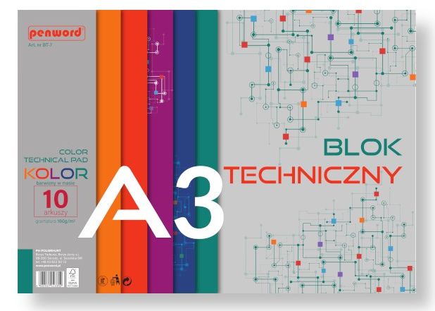 BLOK TECHNICZNY A3 KOLOR BT-7 180g 10 ARKUSZY PREMIUM BARWIONY W MASIE [opakowanie=10szt] (SZPSH)📘 Blok techniczny A3 kolorowy PENWORD BT-7 – Intensywne kolory, profesjonalna jakość!