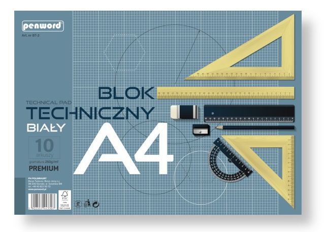 BLOK TECHNICZNY A4 BIAŁY BT-2 250g 10 ARKUSZY PREMIUM [opakowanie=10szt] (SZPSH)📐 Blok techniczny A4 biały PENWORD BT-2 – Maksymalna grubość, maksymalna wytrzymałość!