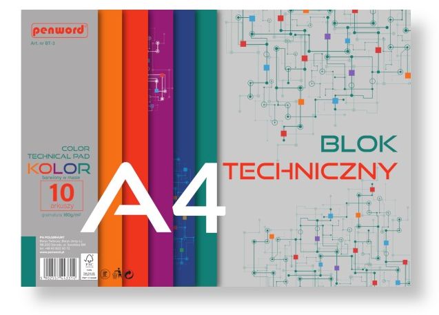 BLOK TECHNICZNY A4 KOLOR BT-3 180g 10 ARKUSZY PREMIUM BARWIONY W MASIE [opakowanie=10szt] (SZPSH)📘 Blok techniczny A4 kolorowy PENWORD BT-3 – Głęboki kolor i wysoka jakość w jednym!