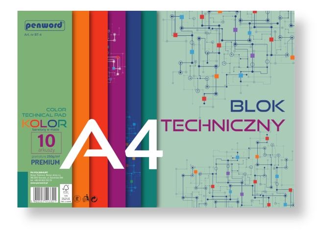 BLOK TECHNICZNY A4 KOLOR BT-4 250g 10 ARKUSZY PREMIUM BARWIONY W MASIE [opakowanie=10szt] (SZPSH)📗 Blok techniczny A4 kolorowy PENWORD BT-4 – Supergruby papier do wyjątkowych projektów!