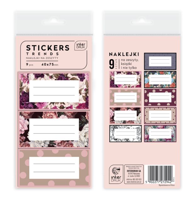Naklejki na zeszyty 9szt.Trends [opakowanie=12szt] Zestaw 9 naklejek na zeszyty z miejscem na podpis. |
