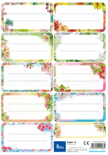 NAKLEJKI NA ZESZYTY I KSIĄŻKI, ZEST. - 25 ARK. (opakowanie=25szt) KN001-10Naklejki na zeszyty i książki - łatwo usuwalne. Na arkuszu znajduje się 9 etykiet. Jednostka sprzedaży: folia 25 arkuszy. Wymiary pojedynczej naklejki:76x42mm Wymiary arkusza:165x232mm Gramatura:80g/m2 |