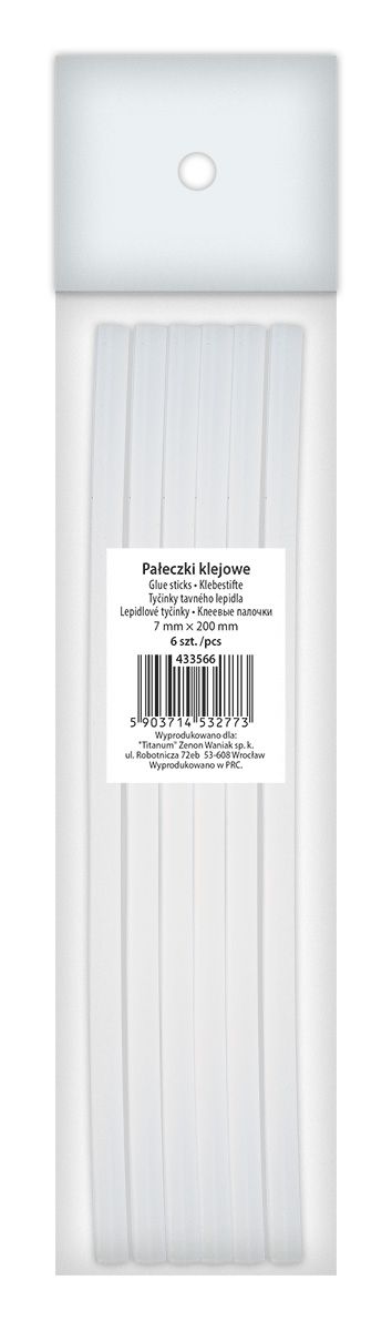 Pałeczki klejowe przezroczyste 7x200mm 6szt.Pałeczki klejowe, średnica: 7 mm, długość: 20 cm, kolor: przezroczysty. 6 sztuk. |