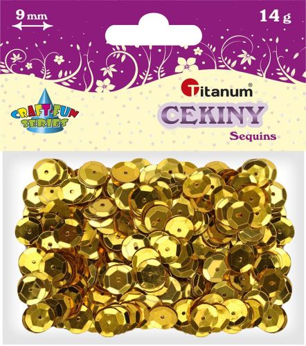 Cekiny okrągłe 9mm metaliczne 14g złote Cekiny okrągłe. Kolor: złoty metaliczny, średnica: 9 mm. Opakowanie: 14 g. |