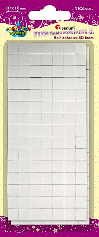 Pianka samoprzylepna 3D biała O6mm plansza 9x9cm 3 arkuszePianka samoprzylepna DWUSTRONNA 3D, biała, średnica 6 mm, plansza 9 x 9 cm, 3 arkusze. |