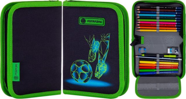 Piórnik pojedynczy dwuklapkowy z wyposażeniem ASTRABAG FOOTBALL MOTION, AC11 [opakowanie=12szt] • 1 komora, 1 wewnętrzna klapka