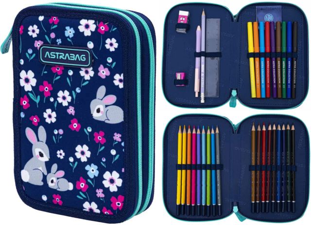 Piórnik podwójny z wyposażeniem ASTRABAG BABY BUNNY, AC21 [opakowanie=12szt]Piórnik z wyposażeniem ASTRABAG BABY BUNNY 🐰🌸 – Uroczy Styl i Szkolna Gotowość!