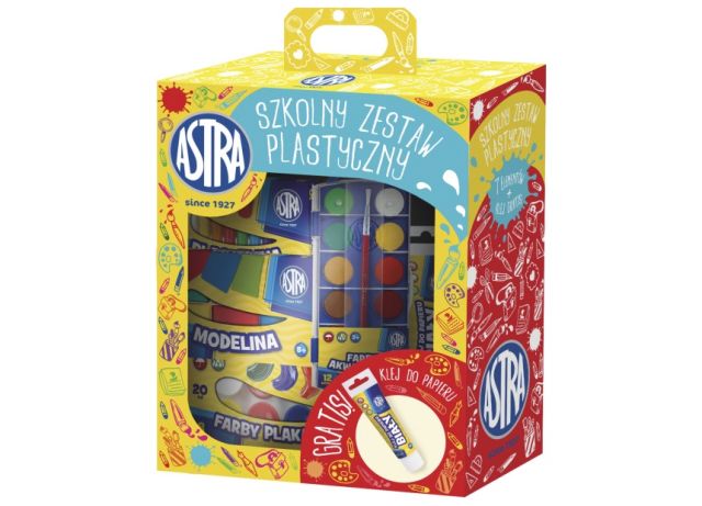 Szkolny zestaw plastyczny Astra - klej gratisSkład zestawu: farby akwarelowe 12 kolorów, farby plakatowe 8 kol. 10 ml, plastelina 10 kolorów, plastelina fluorescencyjna 6 kolorów, modelina 6 kolorów, kubeczek z blokadą wylania, pędzle szkolne rozmiar 2,6,12. Klej biały tuba 35 ml - gratis! |