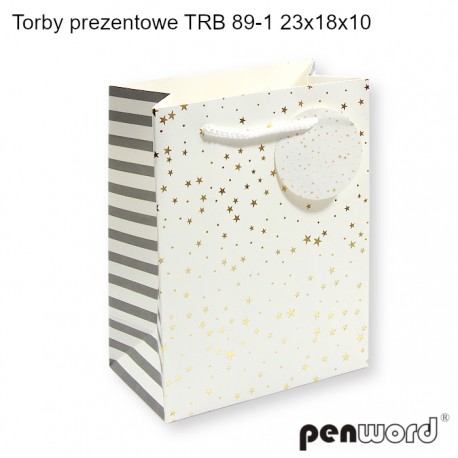 TORBY PREZENTOWE TRB 99-1 BN 23x18x10 [opakowanie=12szt]Torba prezentowa PENWORD TRB 99-1 BN o wymiarach 23 x 18 x 10 cm to elegancka oprawa prezentów, idealna na każdą okazję. Utrzymana w bieli i złocie, z dekoracyjnymi elementami w kształcie prezentów, zachwyca swoim wyrafinowanym wyglądem.