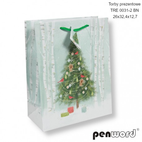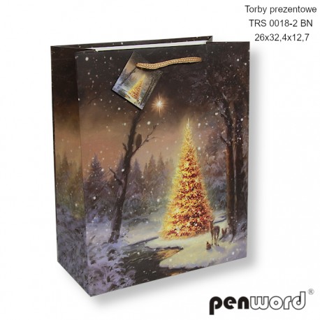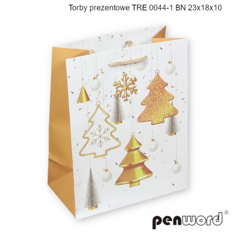 TORBY PREZENTOWE TRE 0044-1 BN 23x18x10 [opakowanie=12szt]Torba prezentowa PENWORD TRE 0044-1 BN o wymiarach 23 x 18 x 10 cm to eleganckie i świąteczne opakowanie, które idealnie podkreśli magię Bożego Narodzenia. Złote detale i choinkowe ozdoby tworzą wyjątkowy, luksusowy wygląd. 🎁✨