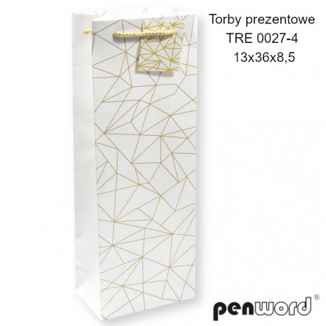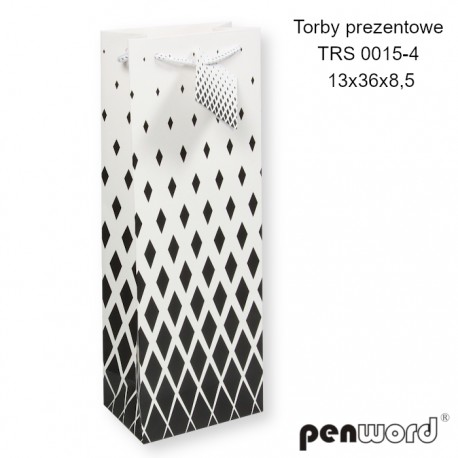 TORBY PREZENTOWE TRS 0024-4 13x36x8.5 cm [opakowanie=12szt]Torba prezentowa PENWORD TRS 0024-4 o wymiarach 13 x 36 x 8,5 cm to idealne opakowanie na butelkę wina lub inny upominek alkoholowy. Wzór z butelką, kieliszkiem i winogronami nadaje elegancki i tematyczny charakter. 🌟