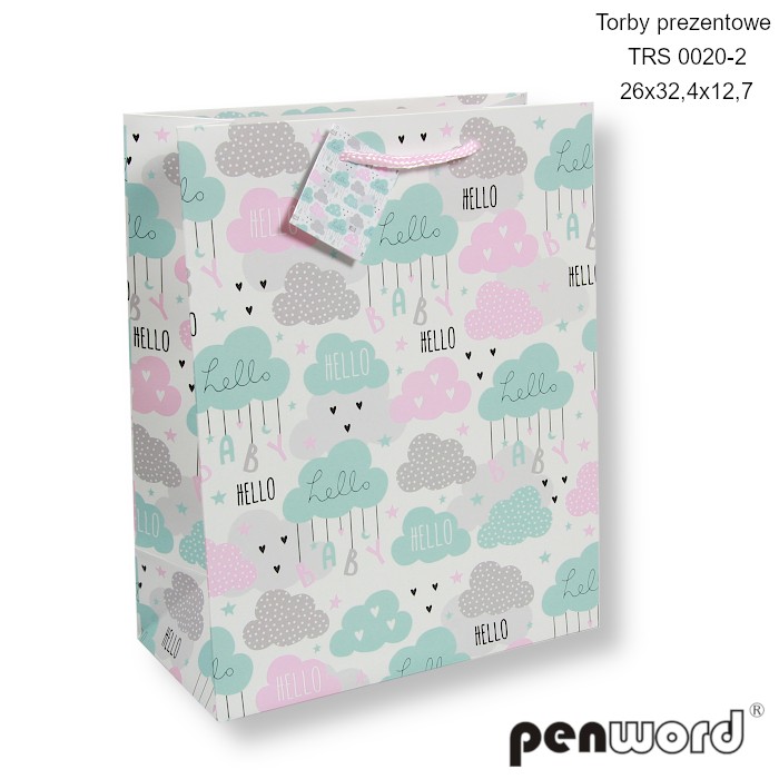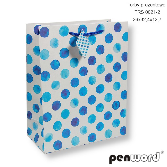 TORBY PREZENTOWE TRS 0021-2 26x32.4x12.7cm [opakowanie=12szt]Torba prezentowa PENWORD TRS 0021-2 o wymiarach 26 x 32,4 x 12,7 cm to idealne opakowanie na różne okazje. Jej delikatny wzór w niebieskie kropki nadaje wyjątkowego uroku i stylu każdemu prezentowi. 🎀