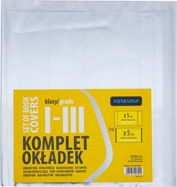Uniwersalny komplet okładek ASTRAPAP do klas I-III• 5 okładek regulowanych w formacie E5 na podręcznik • 5 okładek samoprzylepnych S4 |