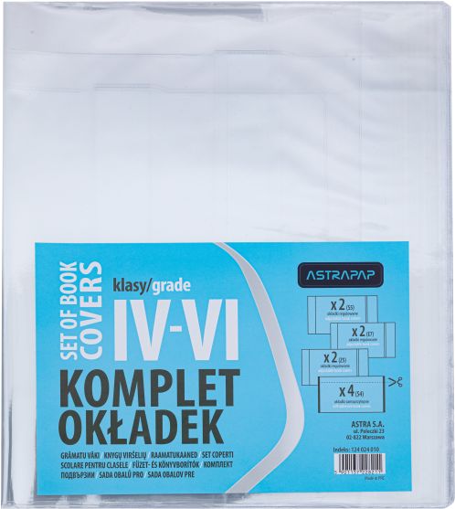 Uniwersalny komplet okładek ASTRAPAP do klas VII-VIII• 2 szt okładek regulowanych E6 • 2 szt okładek regulowanych S5 • 2 szt okładek regulowanych A4 • 4 szt okładek samoprzylepnych S4 |