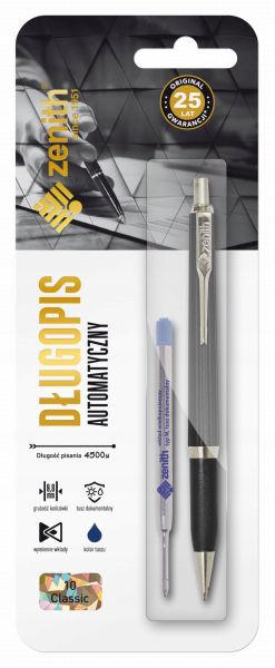 Długopis automatyczny 0, 8 mm ZENITH 10 CLASSIC mix kolorów - 1 szt. blister [opakowanie=20szt]•długopis automatyczny •korpus długopisu wykonany z matowionego tworzywa sztucznego •obudowa dzielona w 1/3 wysokości, obie części korpusu oddzielone mosiężno-niklowaną obrączką •wymienny wkład wielkopojemy Zenith 4 z dokumentalnym... |
