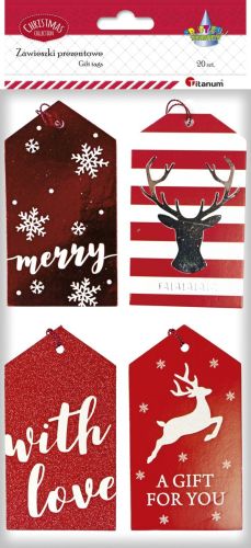 Zawieszki prezentowe Boże Narodzenie 20szt. z nadrukiem jednostronnym 60x110mm tonacja czerwona + sznureczek 4 wzory |