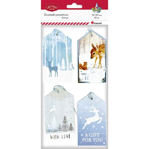 Zawieszki prezentowe Boże Narodzenie 20szt. z nadrukiem jednostronnym 60x110mm tonacja srebrna + sznureczek srebrny 4 wzory Zawieszki do prezentów wykonane z kartonu. W każdej zawieszce jest wycięty otwór na dowieszenie sznureczka. Tylna strona zawieszki nie posiada nadruku.