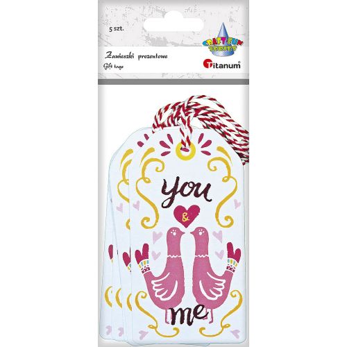 Zawieszki prezentowe 48x110mm gołębie YouxMe sznurek biało-czerwony 5szt. Zawieszki do prezentów wykonane z kartonu. Wymiary zawieszki: 48 x 110 mm. Wzór: gołębie you & me, sznureczek biało-czerwony. Blister 5 szt. |