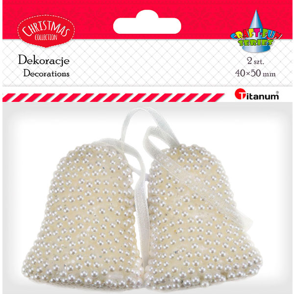 Zawieszki dzwonki 40x50mm na wstążce satynowej oklejone perełkami 2szt.🔔 Titanum Dekoracja na Choinkę – Zawieszki Dzwonki z Perełkami, 40 x 50 mm, 2 sztuki 🔔