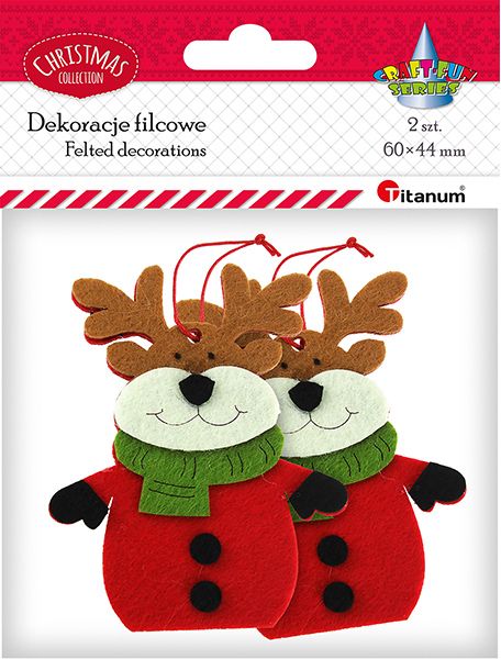 Zawieszki filcowe 3D renifery 75x90mm w czerwonym płaszczu z zielonym szalikiem 2szt.Urocze filcowe zawieszki 3D w kształcie reniferów od Titanum to doskonały wybór na świąteczną dekorację, która doda radości i ciepła Twojemu wnętrzu. Każdy renifer ma na sobie czerwony płaszcz i zielony szalik, które podkreślają jego świąteczny charakter.... |